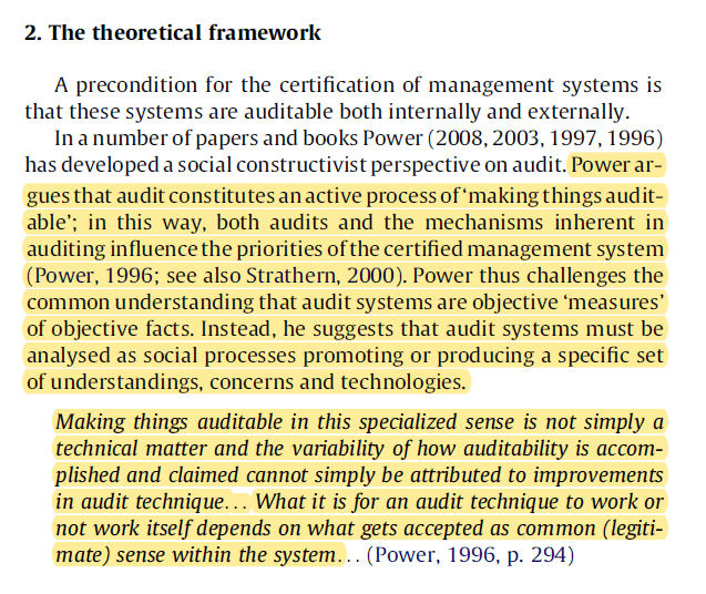 These findings – supported by other studies – support Michael Power’s contention that audits [** and SMS approaches] transform organisational practices in order to “make things auditable”.