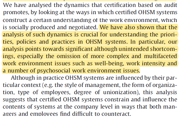 6) They argue “the certified management system does not necessarily tackle the most urgent work environment issues and may exclude important aspects of the work environment such as psychosocial factors”.