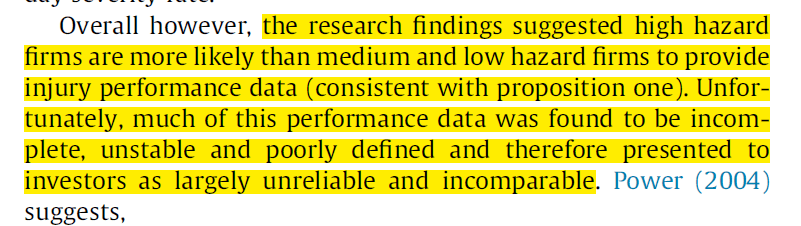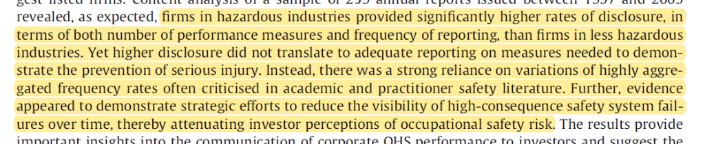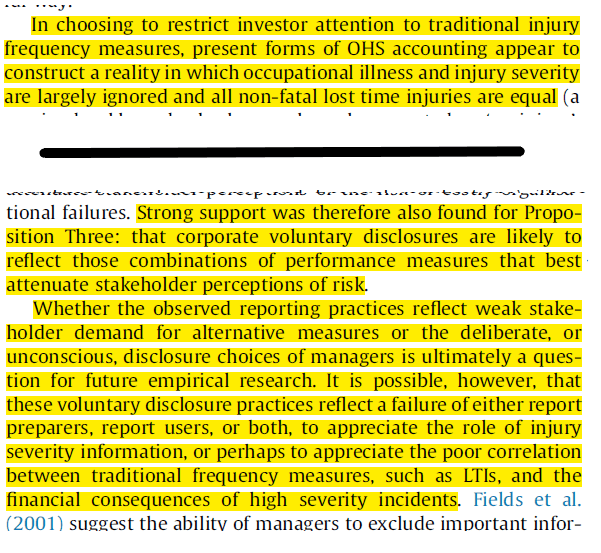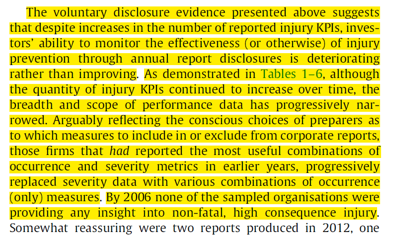 “Of the data presented, the authors also say that “of OHS accounting appear to construct a reality in which occupational illness and injury severity are largely ignored and all non-fatal lost time injuries are equal” (p125), which directs investor attention towards traditional injury metrics of lower consequence.”