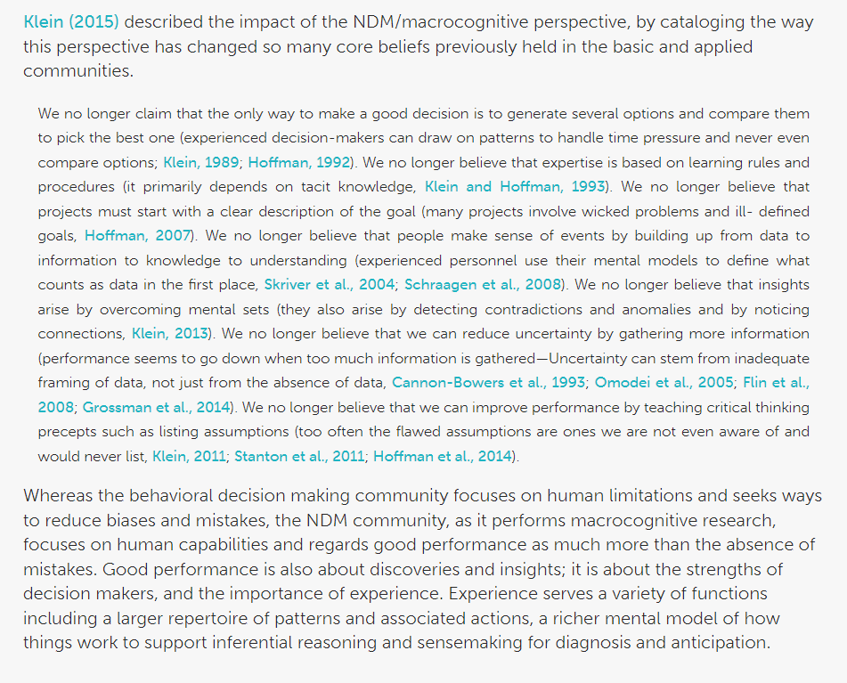 I found this an interesting few paras from Klein & Wright’s 2016 paper, discussing the contributions of macrocognition and NDM (naturalistic decision making).