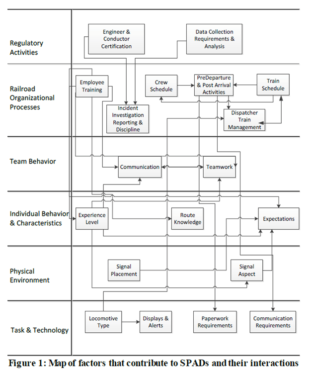 - They draw on Rasmussen’s approach, mapping how factors from across the sociotechnical system interact with each other to produce SPADs – image below.