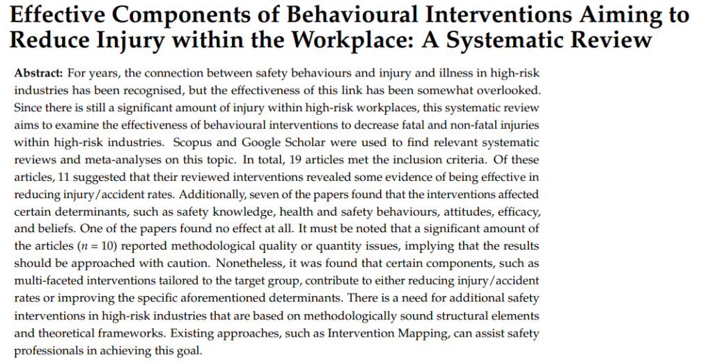 · Of 19 studies, 11 suggested that behavioural interventions were effective in reducing injury/incident rates