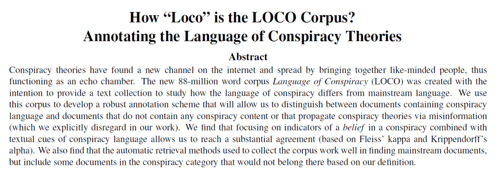 Anyways, this paper explored the discourse of conspiracy believers, based on the 88-million word corpus ‘Language of Conspiracy’ (LOCO). It’s a large, online repository of conspiracy documents/posts used for research.