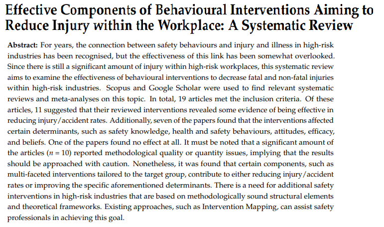 One thought on “Effective Components of Behavioural Interventions Aiming to Reduce Injury within the Workplace: A Systematic Review”