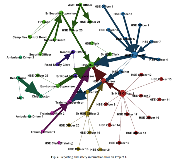 On one of the mega-projects, the network was centralised around the HSE supervisor, followed by the HSE Manager. The authors note that “This can be associated with the fact that all safety communication and reporting on the project passes through the HSE supervisor and as a result of organizational hierarchy”.