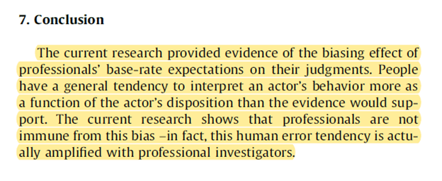 - Professional investigators exhibited a human error bias, but at the same time believed that they were objective and confident in their assessments