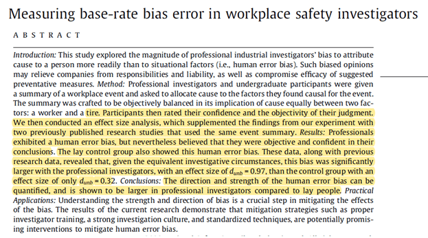 Authors: MacLean, C. L., & Dror, I. E. (2023). Measuring base-rate bias error in workplace safety investigators. Journal of safety research, 84, 108-116.