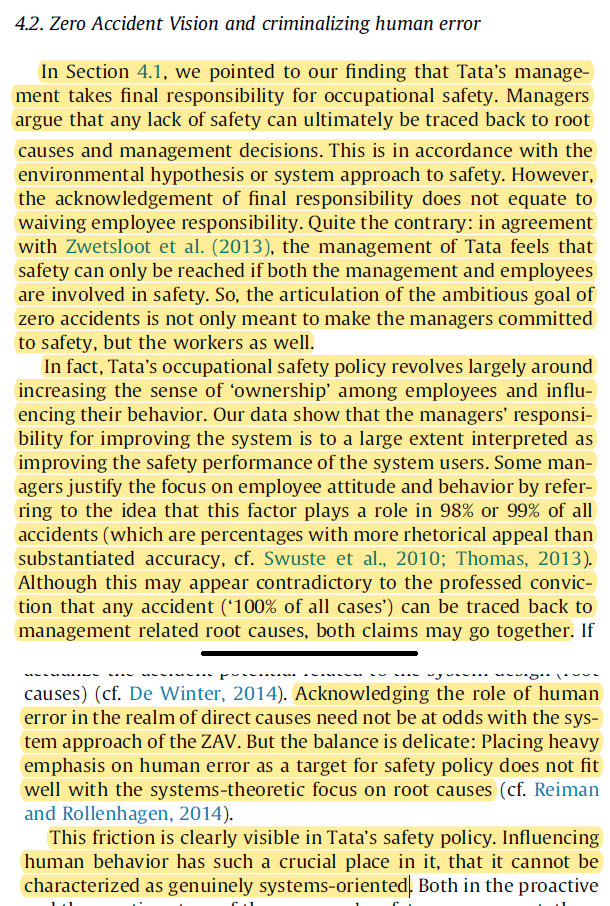 In Tata’s example, while they promote the principles of learning from contextual and contributing factors, in practice “managers also pay considerable attention to direct causes and evidently criminalize individual safety transgressions, without making a clear distinction between honest mistakes and bad intent”.