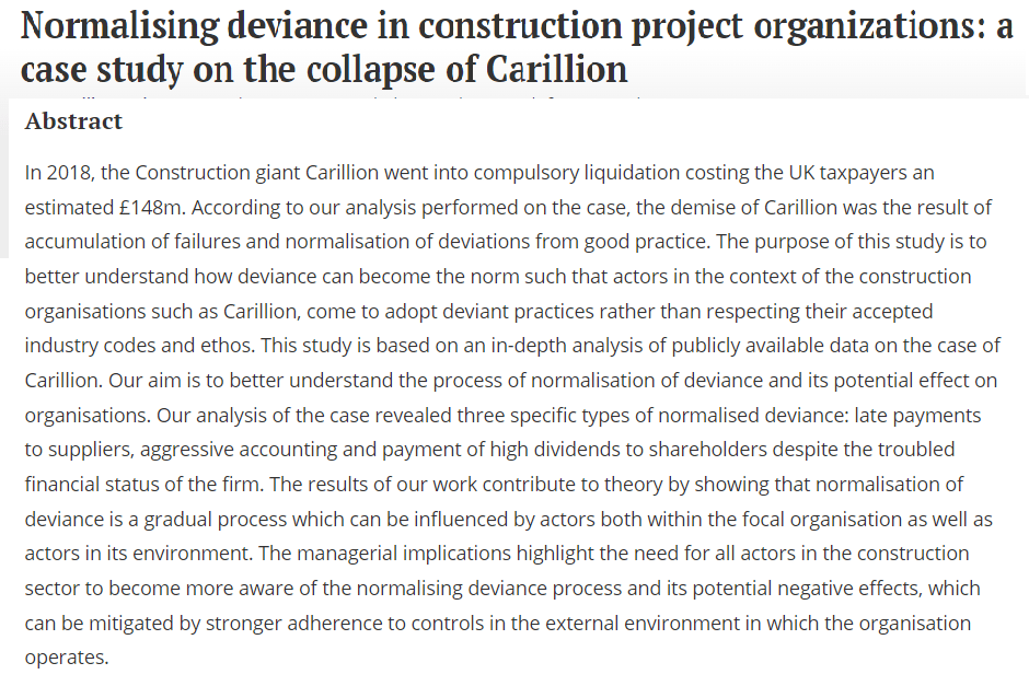 An upcoming summary explored the normalisation of deviance (NoD) in the collapse of British construction and facilities firm Carillion.