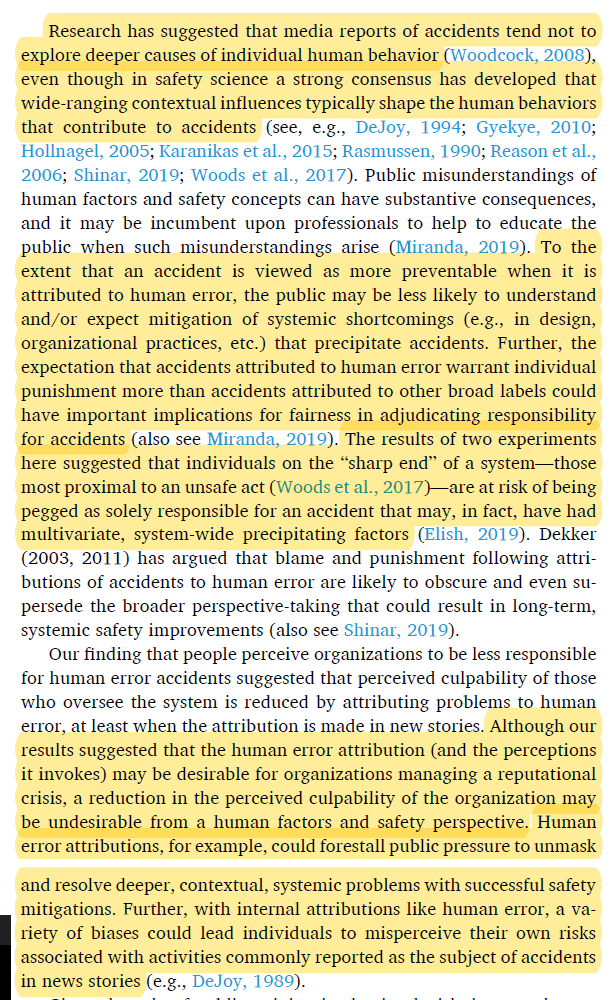 2 thoughts on “Attributions of accidents to “human error” in news stories: Effects on perceived culpability, perceived preventability, and perceived need for punishment”