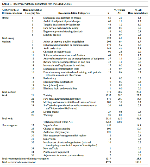 - Another study based in Australia found only a small number of recommendations were rated as strong, and the most common types were reviewing or enhancing documents, and training and education