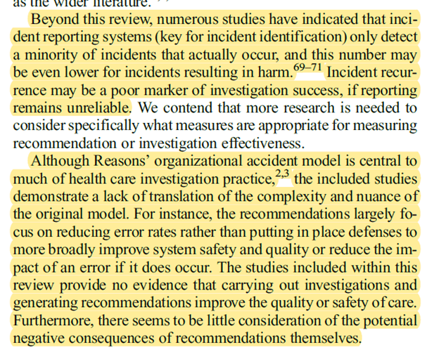 Finally, they argue that “The studies included within this review provide no evidence that carrying out investigations and generating recommendations improve the quality or safety of care”.