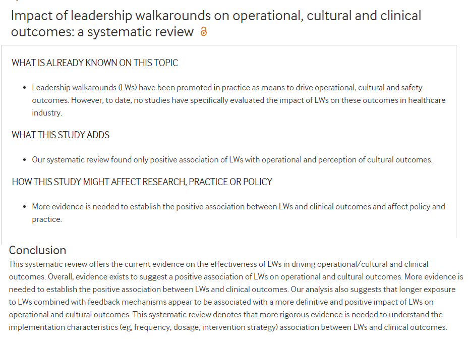 Do Leadership Walkarounds (LWs) positively impact operational, cultural and clinical outcomes? Another systematic review (in healthcare, again) suggests ‘Yes’.