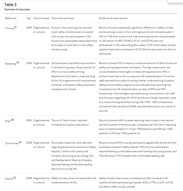 · Another study found LWs resulted in greater perceived effort among team members, 85% reported having a better understanding of patient safety, 76% indicated an increase in reporting or discussion of incidents and near misses, and 91% of unit managers reported having had conversations with staff following the LW.