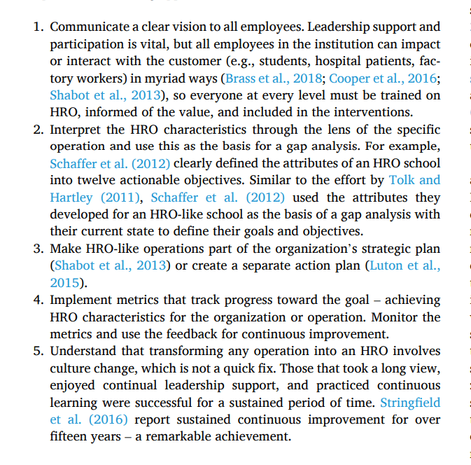 Some research argued that both HRO and RE researchers “failed to publish specific safety enhancing strategies for various parts of a single, or system of organizations” (p6). Other argued the difficulty of even separating HRO interventions from other concurrent ones such that it’s hard to know if improvement is attributable to HRO practices or not.