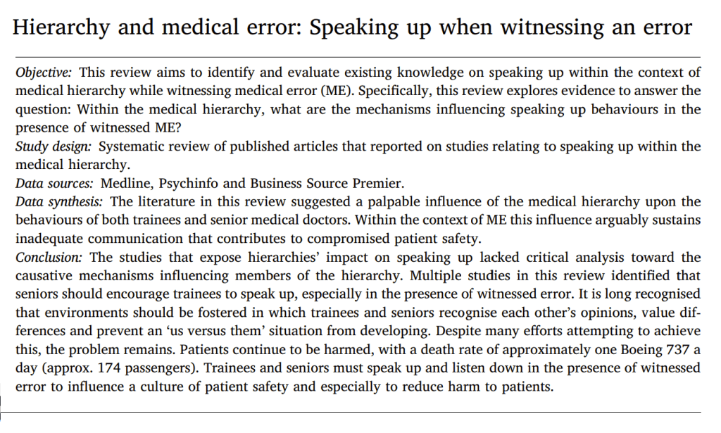 A 2020 study evaluated 19 papers for the links between hierarchy and voice behaviour in response to human performance variability (e.g. medical errors and the like).
