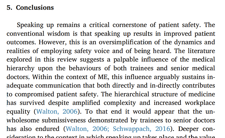 A consistent theme was that “hierarchy can be detrimental to open communication and that failure to challenge contributes to patient morbidity and mortality (M&M)”. That is, not speaking up and inhibited communication due to hierarchy is associated with poorer patient safety outcomes.