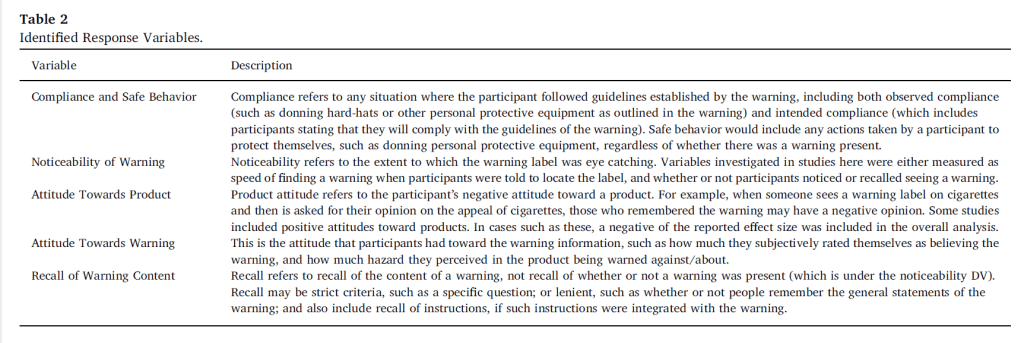They note “behavioral compliance is not simply and linearly related to the differing facets of the warning but vary based on numerous moderating influences”.