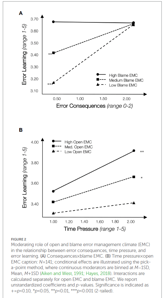 Specifically, they looked at how an open error climate (open EMC) or blame error climate (blame EMC) moderates the relationship between four work conditions and learning from errors.