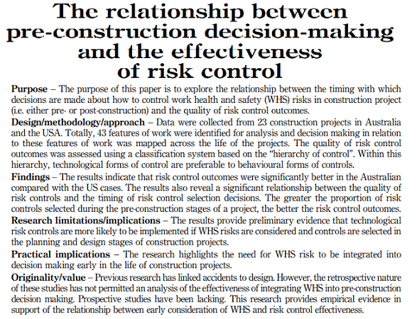 Thus, the “greater the proportion of risk controls selected during the pre-construction stages of a project, the better the risk control outcomes” (p108). They note that under the assumption that higher order controls will have greater risk reduction effects, the results support the notion that the ability to influence health and safety will be lower if left to the construction phase.