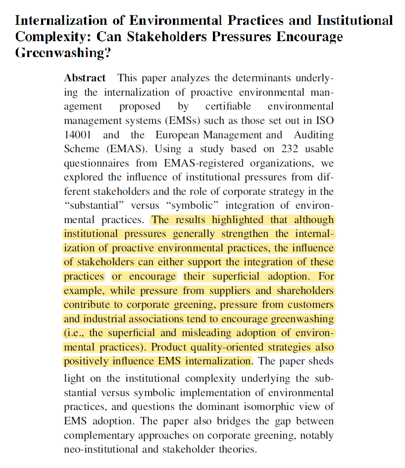 2 thoughts on “Internalization of Environmental Practices and Institutional Complexity: Can Stakeholders Pressures Encourage Greenwashing?”