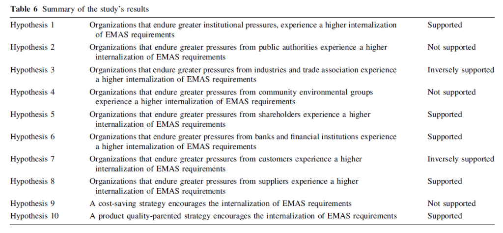 They note that, “stakeholder pressure for the adoption of a certified EMS does not necessarily strengthen environmental practices and performance in this area” and that, in certain cases, “such pressure could even increase the contradictions between the appearance of corporate greening through certifiable EMSs and the actual practices inside the organization”.