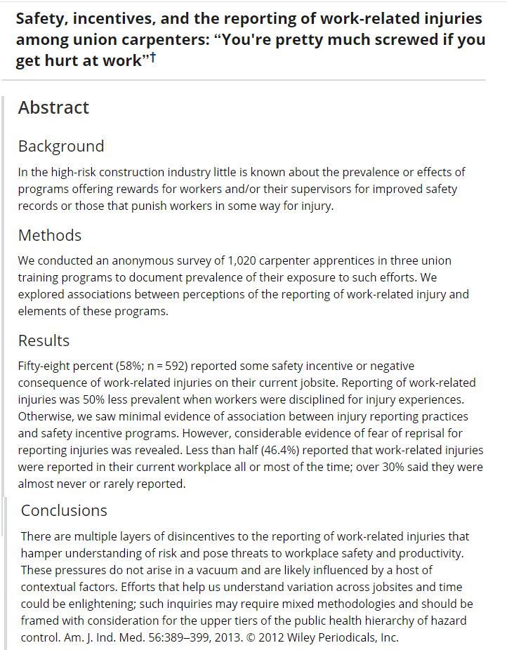 Further based on interviews, it was commented that “The incentive programs for crews and foremen with low injuries often lead to accidents or injuries being hidden. ‘‘Don’t report it and we’ll get a bonus at 100 days” (p392). One person worked for a company where they had to maintain a 0% accident rate to be able to keep their contract with a major company. This person noted that “I got the impression, which was strongly implied, if I got hurt I was no longer employed” (p395).
