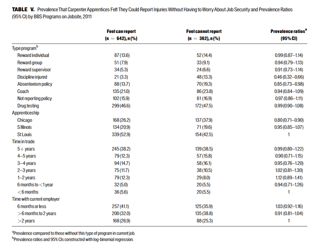 Specifically about the apprentice carpenter’s views about reporting, 64% felt comfortable reporting injuries to their supervisor without worry of reprisal, but 22% felt they couldn’t report (& 14% were unsure).