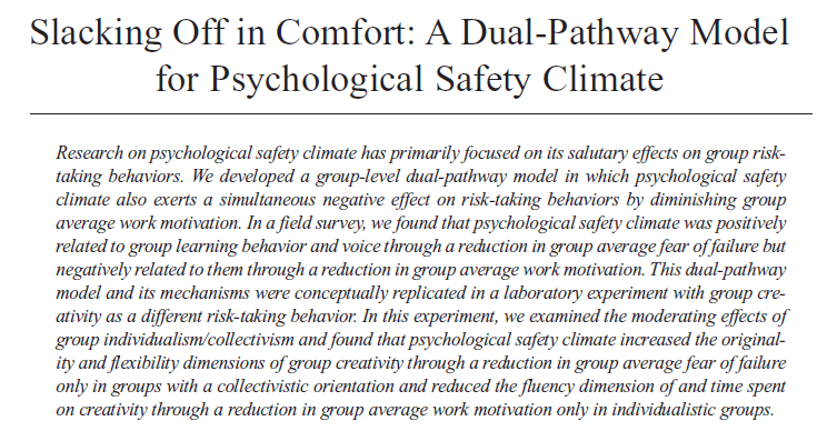 While “Organizations are advised to create a psychologically safe group environment to promote important behaviors” these results “provides a clear demonstration that this advice is oversimplistic”.