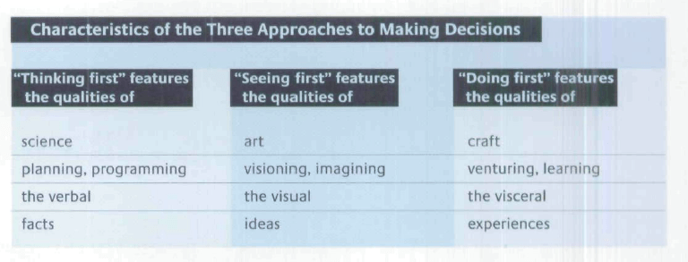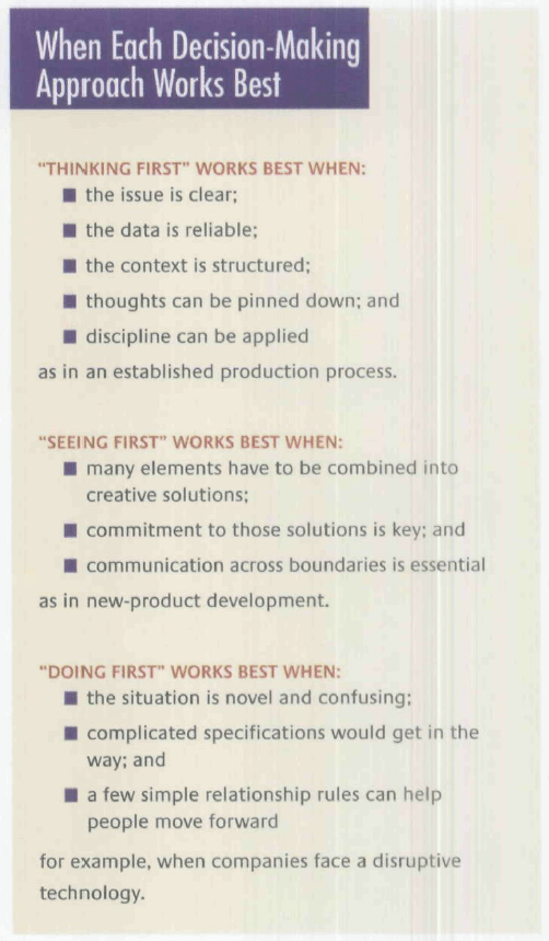 1. Thinking first – works well when the issue is clear and data is reliable. Whereas a conventional belief may be that we follow a rational decision making approach from defining -> diagnosing -> designing -> deciding, the “rational approach turns out to be uncommon”.