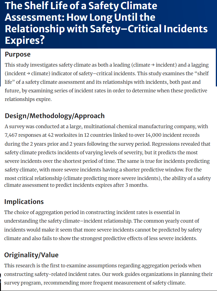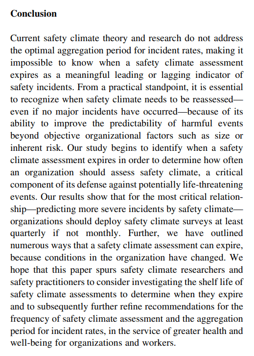 As a leading indicator: When predicting the more severe incidents is strongest in the month following the SC survey and “expires after 3 months”. Thus, quoting the authors “results indicate that the assumption (often unstated in organizations) that a safety climate survey can be conducted annually—like a typical job satisfaction survey or a health insurance satisfaction survey— and be assumed to retain its explanatory power for 12 months is incorrect, at least for more threatening events” (p533).
