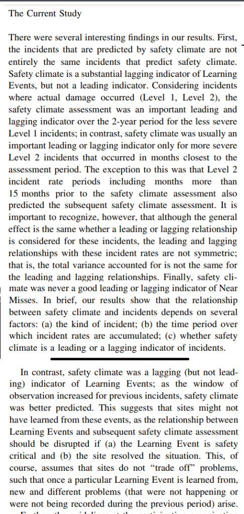 SC as lagging indicator: in contrast to SC as leading, results indicate that each of the four incident types predict later SC performance. Nevertheless, “safety climate was never a good leading or lagging indicator of Near Misses” (p534). That is, near misses weren’t predicted by SC, nor did were a good predictor of subsequent SC performance.