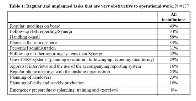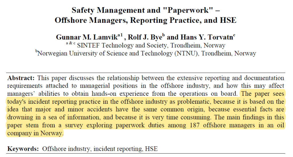 In sum, findings highlight that “HSE reporting are regarded as very obstructive to the ability to perform “hands-on” management”, and having the incident reporting system “representing a major hindrance for safety-critical outdoor work was hardly the intention behind the introduction of this HSE tool”.
