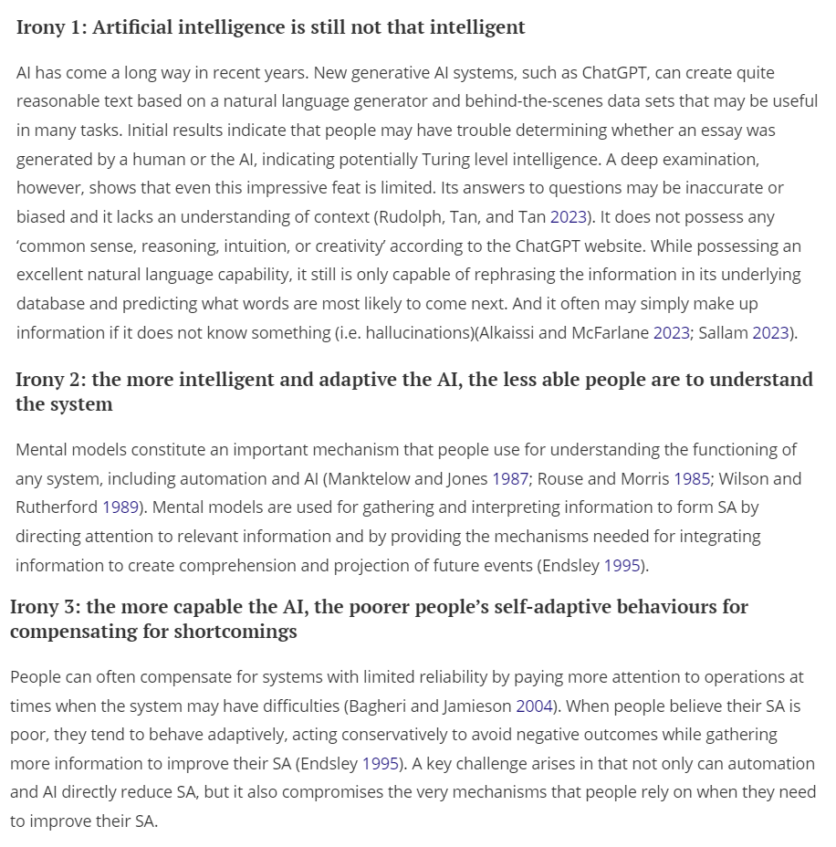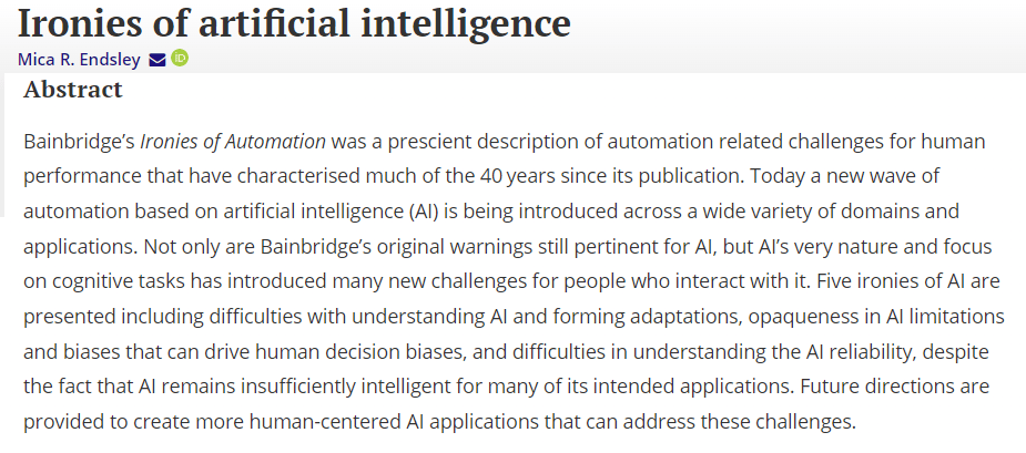 Ref: Endsley, M. R. (2023). Ironies of artificial intelligence. Ergonomics, 1-13.