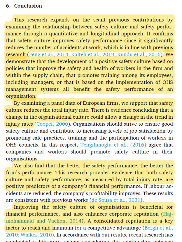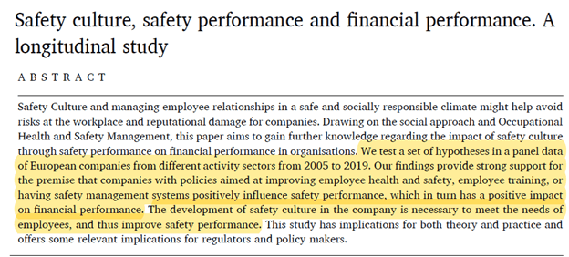 · “This research provides evidence that both safety culture and safety performance, as measured by total injury rate, are positive predictors of a company’s financial performance”.
