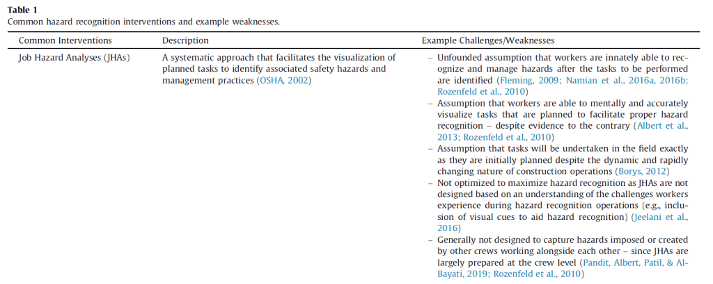 One thought on “Evidence-based weaknesses of common hazard recognition interventions – JHA/JSA, safety training and safety checklists”