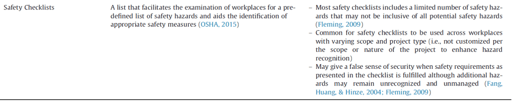 - Safety checklists: many checklists only capture a limited subset of hazards, may not be customised for the setting/context, and may “give a false sense of security when safety requirements in the checklist is fulfilled”