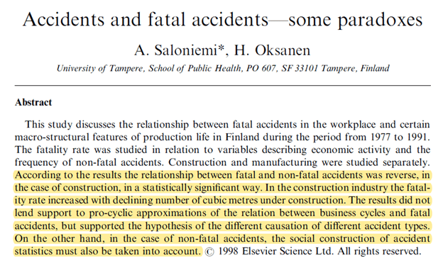 Authors: Saloniemi, A., & Oksanen, H. (1998). Accidents and fatal accidents—some paradoxes. Safety Science, 29(1), 59-66.