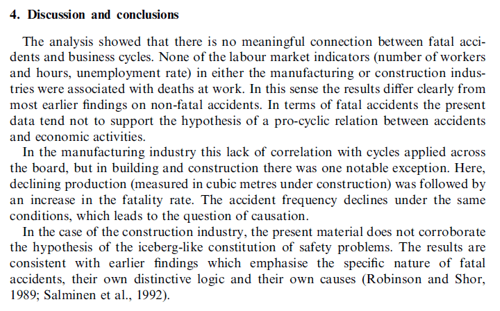 Discussing the findings, they observe that “there is no meaningful connection between fatal accidents and business cycles” and none of their labour market indicators as mentioned above were associated with workplace deaths. This is with the exception of declining production, which was followed by an increase in fatalities.
