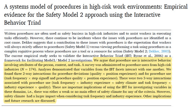 One thought on “A systems model of procedures in high-risk work environments: Empirical evidence for the Safety Model 2 approach using the Interactive Behavior Triad”