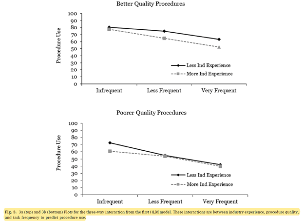 They note that “positive safety climates and procedure quality both reduce the task frequency effect on procedure use for those with less industry experience—specifically, their use of procedures does not decrease as much as those with more experience”.