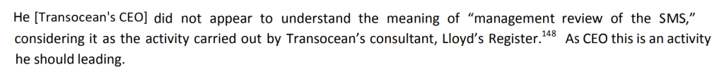 The third extract comes from one of the (many) Macondo investigation reports. It highlights the misplaced understanding that the CEO had about internal system reviews – believing it to be a function for the consultants (or safety people), rather than an activity that leaders must own and drive.