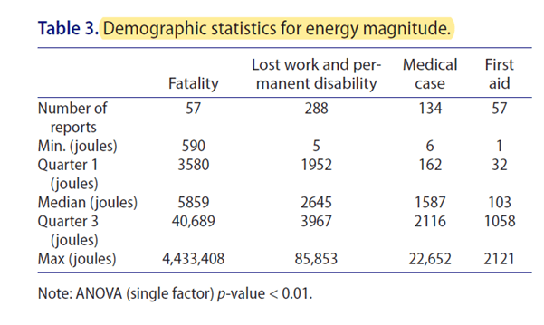 What is the relationship between the magnitude and intensity of energy in workplace sources on fatal and non-fatal accidents? A 2017 study to be posted soon explored these links based on 500 injury reports.
