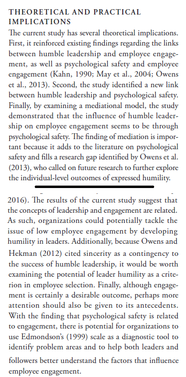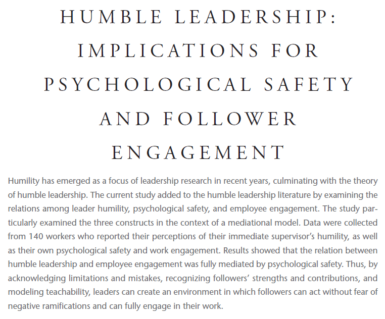 That is, psychological safety may serve as a key mechanism “by which leader-expressed humility fosters employee engagement in followers”.