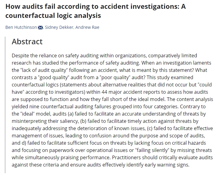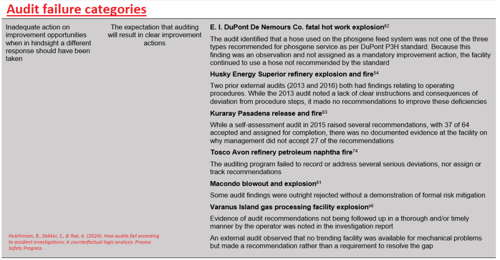 Our recent study of 44 major or fatal accident reports in the process, chemical, pipeline, mining, oil & gas industries explored how audits failed prior to the accident (according to the investigation).
