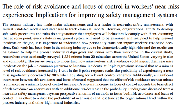 What are the links between risk avoidance and locus of control in workers experiencing near misses? A study to be posted soon explored these links from >1.3k US miners.