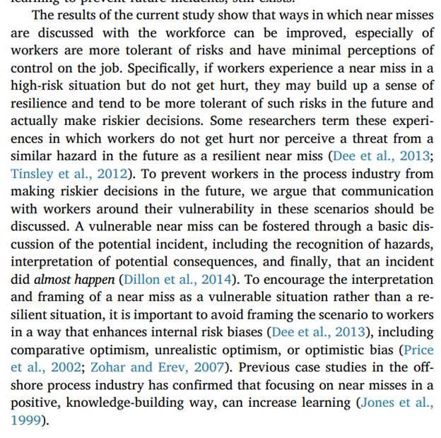 Finally, near misses aren’t a single monolithic construct. That is, you can have resilient near misses and vulnerable near misses. Resilient near misses are ‘it narrowly went right’, hence, success is emphasised. These types of near misses can desensitise people to danger.