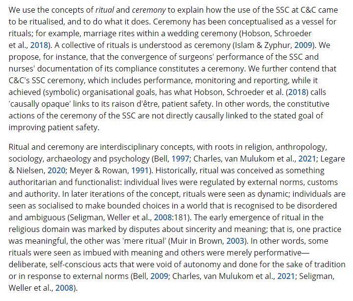 Hence, these rituals “obfuscate the discordant SSC performances, the actual usage of the SSC and create what Hobson, Schroeder et al. (2018) call ‘causally opaque’ links to patient safety”.
