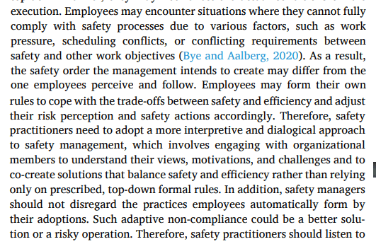 They argue that while safety rules are established in a top-down manner to standardise and constrain behaviour, “they may not reflect the actual conditions of rule execution”.