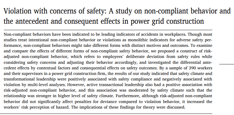 What are the links between risk perception, safety climate, safety leadership and rule departure/adaptation? An upcoming summary explored these links in a sample of 390 power grid construction workers.